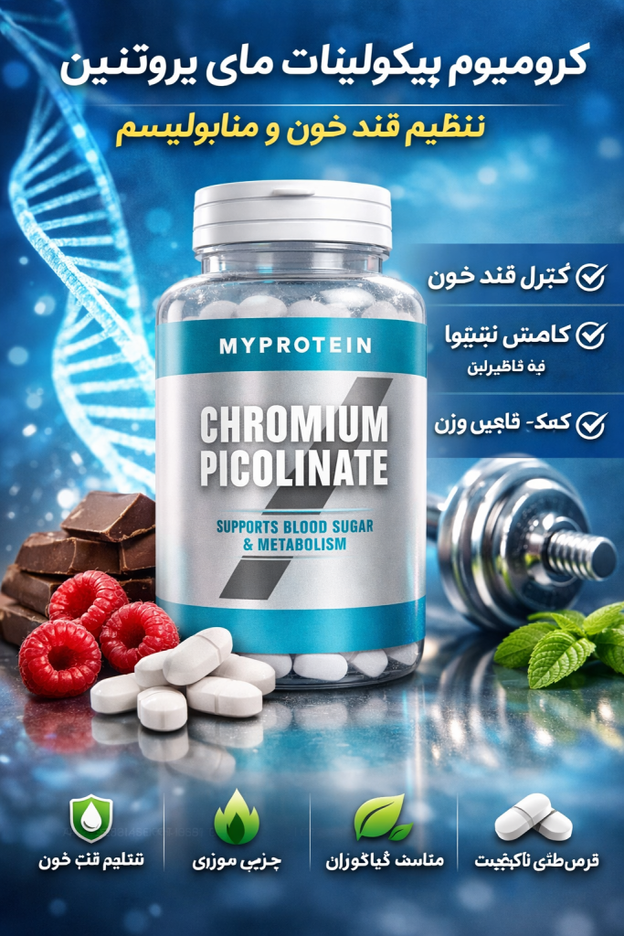 کرومیوم پیکولینات یکی از فرمهای زیستدسترس کرومیوم است که جذب بالاتری نسبت به سایر اشکال دارد. این ترکیب با افزایش حساسیت سلولها به انسولین، به کنترل بهتر قند خون کمک کرده و در متابولیسم کربوهیدراتها، چربیها و پروتئینها نقش دارد.